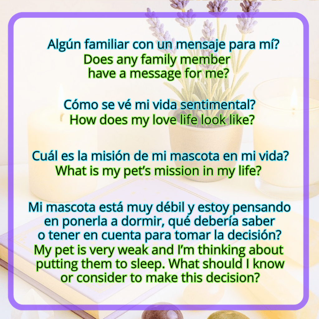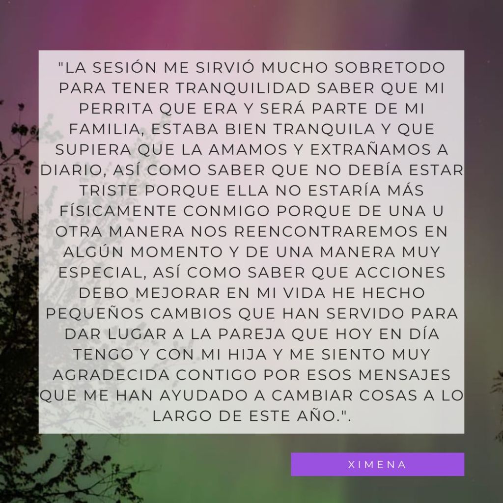 Todo lo anterior también aplica a nuestras mascotas. Podemos saber si algo les está incomodando, como están de salud, si están pasando por un proceso donde crean estar listas para despedirse, o si ya se fueron, saber si tienen algún mensaje para nosotros.